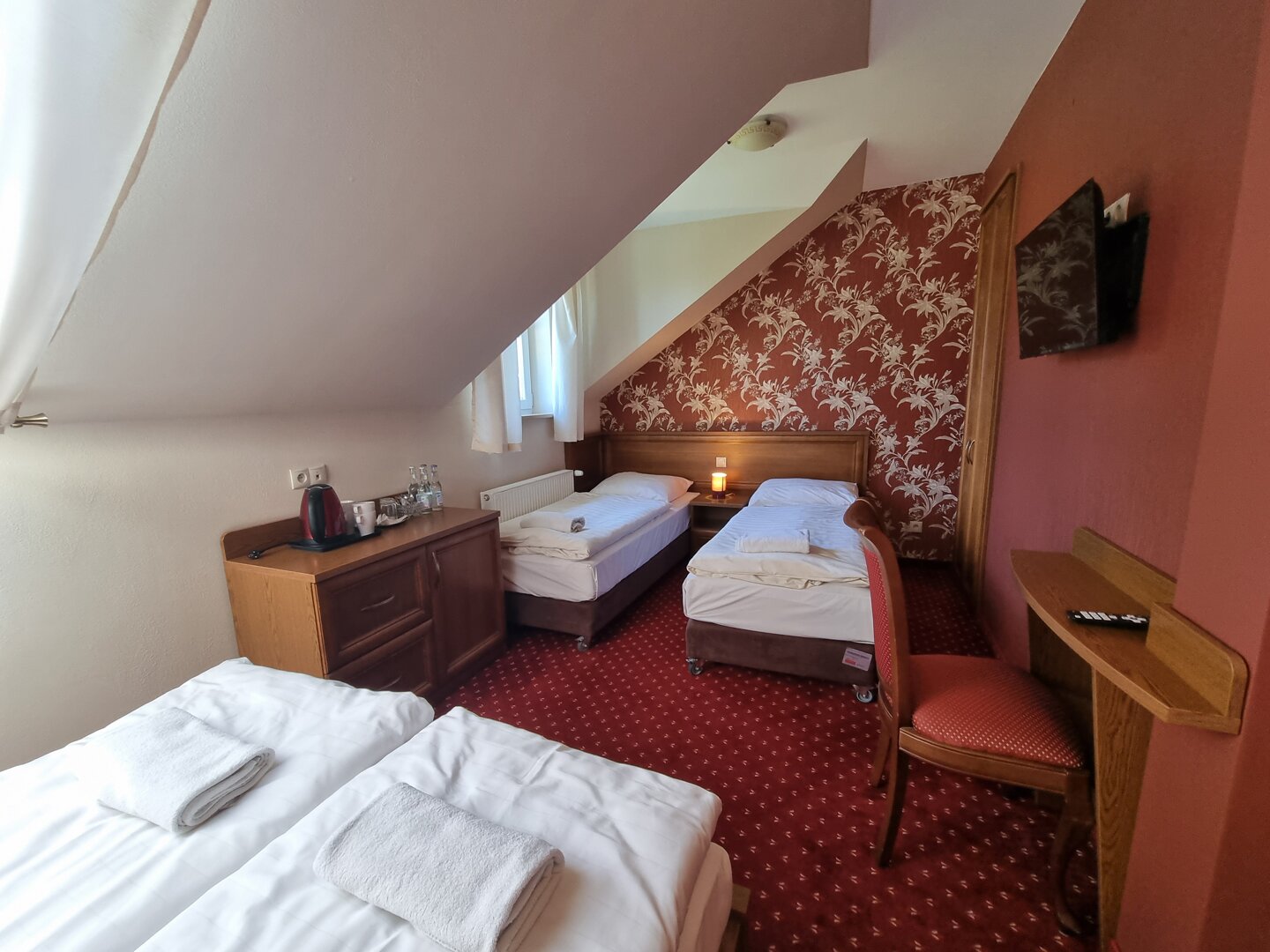 Przytulny stylowy pokój z wykładzina podłogowa, wyposażony w luksusowe meble dębowe (biurko, wieszak na ubrania, garderoba, bagażnik hotelowy, stolik nocny, wygodne krzesła) i łóżka ze specjalnymi zdrowotnymi materacami. Materiały wykonczenia gwarantują dźwiękoszczelność.