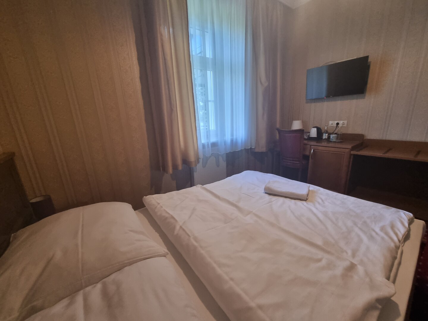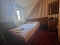 wieszak na ubrania, garderoba, bagażnik hotelowy, stolik nocny, wygodne krzesła) i łóżka ze specjalnymi zdrowotnymi materacami. Materiały wykonczenia gwarantują dźwiękoszczelność.